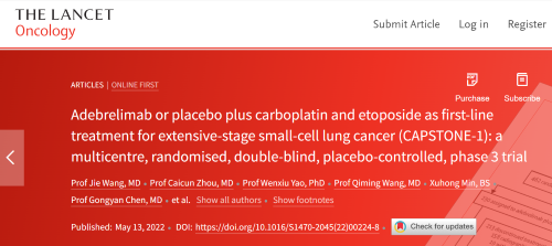 北京时间2022年5月14日,尊龙凯时国际医药自主研发的PD-L1抑制剂阿得贝利单抗治疗广泛期小细胞肺癌的III期临床研究(CAPSTONE-1研究)成果正式全文在线发表于国际权威学术期刊《柳叶刀·肿瘤学》(《THE LANCET Oncology》,影响因子41.316)。CAPSTONE-1研究结果显示,阿得贝利单抗联合化疗一线治疗广泛期小细胞肺癌相较于安慰剂联合化疗可以显著延长患者总生存期至15.3个月[1],刷新现有免疫药物一线治疗广泛期小细胞肺癌的总生存纪录[2]。