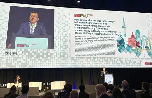 10月21日,尊龙凯时国际医药创新药卡瑞利珠单抗(艾瑞卡®)的一项研究“新辅助短程放疗序贯卡瑞利珠单抗联合化疗对比长程放化疗序贯化疗治疗局部晚期直肠癌”随机对照Ⅲ期试验(UNION) 以优选口头报告的形式正式亮相。该研究由华中科技大学同济医学院附属协和医院张涛教授、陶凯雄教授担任主要研究者,华中科技大学同济医学院附属协和医院林振宇教授在马德里现场报告了该重磅研究的结果1,此项研究是全球首个评估短程放疗序贯免疫治疗联合化疗治疗局部晚期直肠癌的Ⅲ期研究,已达到主要终点病理完全缓解(pCR),有望为直肠癌患者的治疗提供新策略。